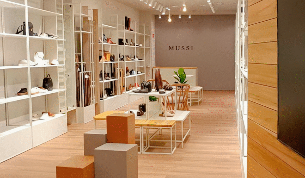 Proyecto de mobiliario comercial para MUSSI en CC Fontanar, con soluciones de exhibición a medida que refuerzan su identidad de marca y mejoran la experiencia en tienda.